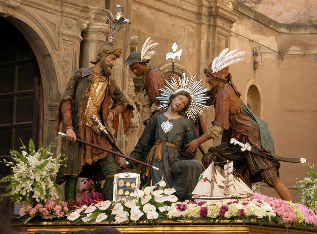 Spettacolare processione dei misteri con 20 gruppi statuari in legno e argento portati a spalla dai fedeli