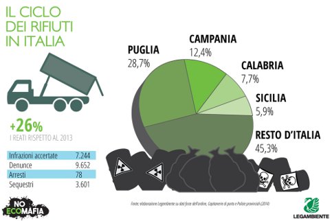 Cresce l’incidenza criminale nelle quattro regioni a tradizionale presenza mafiosa (Puglia, Sicilia, Campania e Calabria), dove si è registrato più della metà del numero complessivo di infrazioni (ben 14.736), con 12.732 denunce, 71 arresti e 5.127 sequestri. Si registra un calo dei reati in Campania (-21% circa), dovuto forse ai tanti riflettori accesi di recente sulla regione, e un aumento degli illeciti in Puglia, col 15,4% dei reati accertati (4.499), 4.159 denunce e 5 arresti. Crescono i reati nel ciclo dei rifiuti (+ 26%) e le inchieste sul traffico organizzato di rifiuti (art.260 Dlgs 152/2006), che arrivano addirittura a 35. Aumentano anche gli illeciti nel ciclo del cemento: 5.750 reati (+4,3%), realizzati soprattutto in Campania e poi in Calabria, Puglia e Lazio.