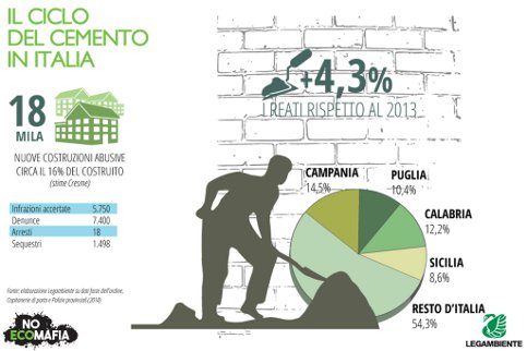 Crescono anche i reati accertati nel settore del cemento, 5.750 (+ 4,3%), mentre la Campania si conferma regione con il più alto tasso di illegalità, seguita da Calabria, Puglia e Lazio. A questi dati vanno aggiunte le stime sull’abusivismo edilizio elaborate dall’Istituto di ricerca Cresme Consulting, che nel 2014 sarebbe quantificabile in circa 18mila nuove costruzioni fuori legge, circa il 16% del nuovo costruito, con un giro d’affari che supera abbondantemente il miliardo di euro.