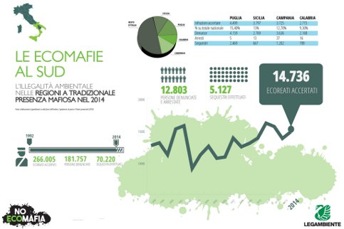 Numeri e storie di corrotti, clan e inquinatori, sono state illustrate a Roma da Legambiente per la presentazione del Rapporto Ecomafia 2015, alla presenza di Rossella Muroni, direttrice nazionale di Legambiente, Vittorio Cogliati Dezza, presidente nazionale di Legambiente, Alessandro Bratti, presidente della Commissione di inchiesta sul ciclo dei rifiuti, Donatela Ferranti, presidente della Commissione giustizia della Camera, Salvatore Micillo, copromotore della legge sugli ecoreati, Andrea Orlando, Ministro della Giustizia, Serena Pellegrino, copromotrice della legge sugli ecoreati, Ermete Realacci, presidente della Commissione ambiente della Camera e copromotore della legge sugli ecoreati, Franco Roberti, procuratore nazionale antimafia. Durante la presentazione è stato letto anche messaggio di saluto inviato dal Presidente della Repubblica Sergio Mattarella, che sottolinea: "Ricostruire un equilibrio tra territorio e società, tra sviluppo e cultura, tra ambiente e diritto della persona è anzitutto la grande impresa civica a cui ciascuno di noi è chiamato con responsabilità. Il rispetto dell’ambiente è essenziale per la coesione sociale e per la ripresa del Paese".