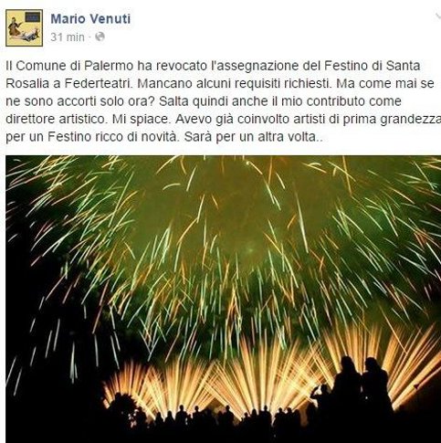 Ecco, Mario Venuti non si occuperà della Santuzza di Palermo. Il Comune di Palermo, infatti, ha revocato l'appalto del Festino assegnato una settimana fa a Federteatri, che aveva affidato la direzione artistica al cantante: l'associazione di teatri palermitani aveva dichiarato che non avrebbe affidato subappalti, ma senza affidarsi a terzi non potrebbe organizzare lo spettacolo pirotecnico, le luminarie e gli allestimenti tecnici. L'appalto viene dunque assegnato alla seconda classificata, l'associazione temporanea di imprese formata da Agave e Tecnoline che ha proposto come direttore artistico Lollo Franco.