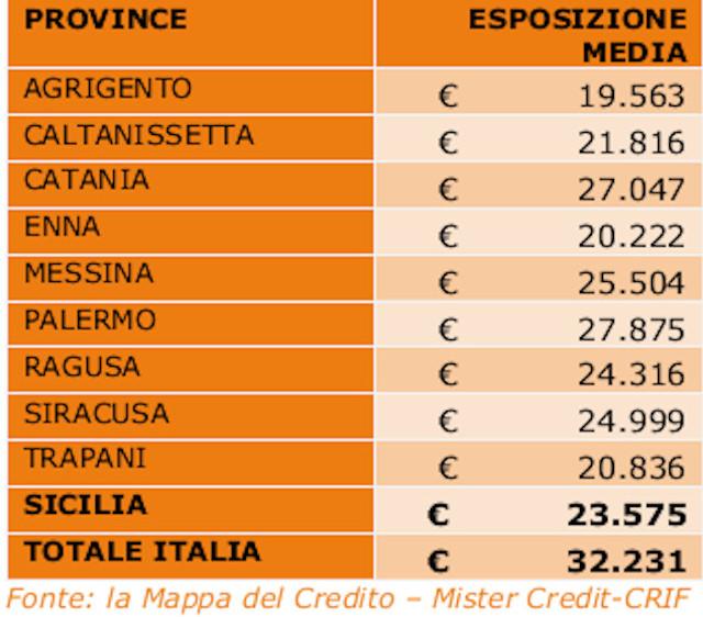 La provincia con l'esposizione residua più elevata risulta essere Palermo, con €27.875, al contrario, quella che risulta meno esposta è Agrigento, con un indebitamento medio di €19.563, che colloca la provincia al penultimo posto assoluto, davanti solo a Reggio Calabria (€18.455).