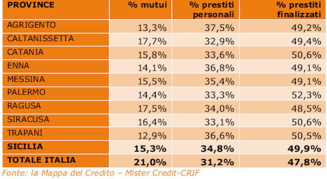 A livello provinciale, Caltanissetta guida la classifica regionale per quanto riguarda i mutui, con una quota del 17,7%, Agrigento vanta il primato relativamente ai prestiti personali, con il 37,5% sul totale dei contratti di credito attivi, mentre Palermo si distingue per l'incidenza dei prestiti finalizzati, con il 52,3%.