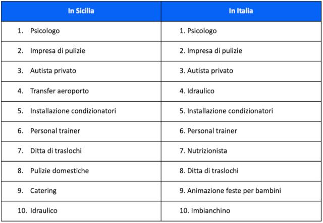 A livello regionale, le richieste di servizi sono più o meno omologhe in tutte le province, unica voce fuori dal coro è la provincia di Palermo, che vede al nono posto della classifica gli osteopati, che non trovano spazio nella Top 10 complessiva dell'isola e in quella provinciale scalzano i servizi di catering.