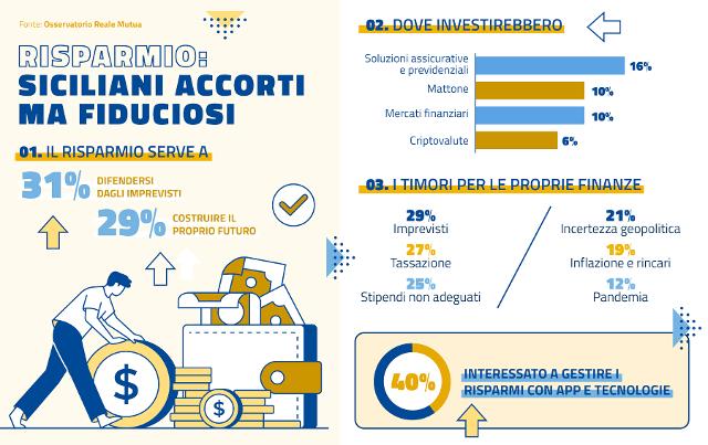 Accorti ma fiduciosi. Nonostante le turbolenze dell'attualità, non è il pessimismo a dominare il rapporto degli abitanti della Sicilia con il risparmio. Anzi, rileva l'Osservatorio Reale Mutua sul welfare*, se un 31% assegna alle sue risorse una funzione ancora prettamente difensiva, un 29% le vede oggi come uno strumento per iniziare a pianificare il proprio futuro economico e realizzare sogni nel cassetto repressi negli ultimi anni.